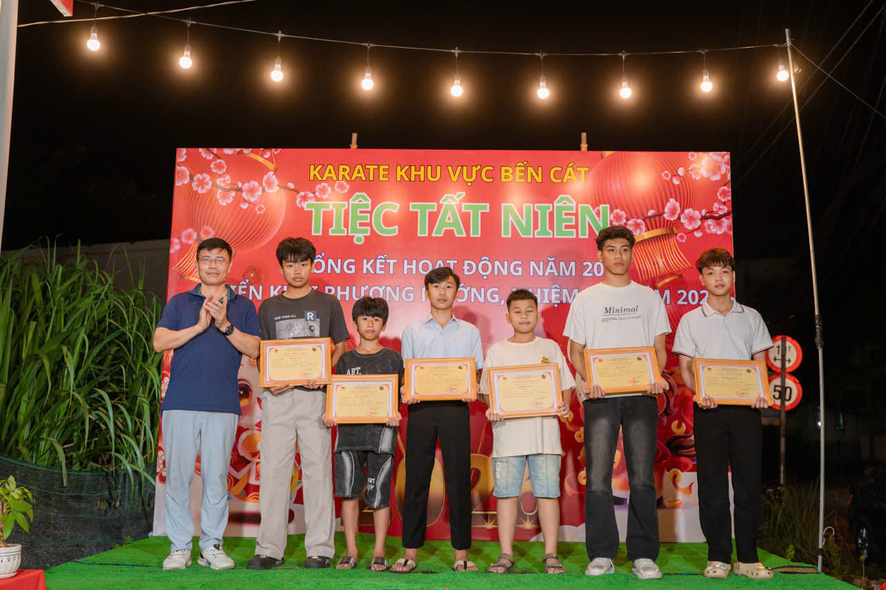 Trong khuôn khổ buổi lễ, Karate Bến Cát đã trao giấy khen cho các võ sinh và huấn luyện viên có nhiều đóng góp tích cực trong việc xây dựng và phát triển phong trào Karate Bến Cát năm 2025; đồng thời tuyên dương, khen thưởng các võ sinh đạt thành tích thi đấu xuất sắc trong năm. Dịp này, Ban Tổ chức cũng trao Bằng Đai đen Quốc gia cho các võ sinh đủ điều kiện, trao đai đen cho các võ sinh đã tham dự và đạt kết quả tại kỳ thi đai tổ chức tại tỉnh Đồng Nai, ghi nhận quá trình rèn luyện nghiêm túc, bền bỉ và nỗ lực không ngừng của các võ sinh.